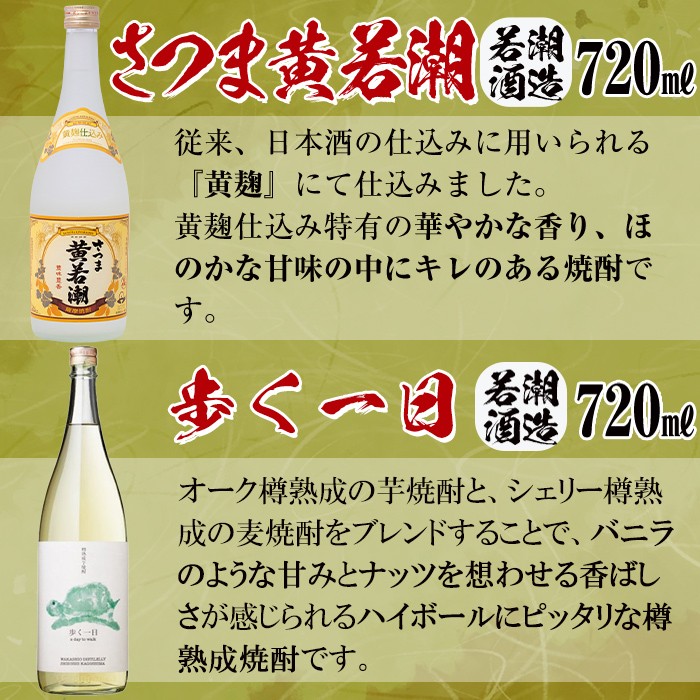 | 容量 | 白若潮25度900ml×1本 黒若潮25度900ml×1本 黄若潮25度720ml×1本 歩く一日33度720ml×1本 |