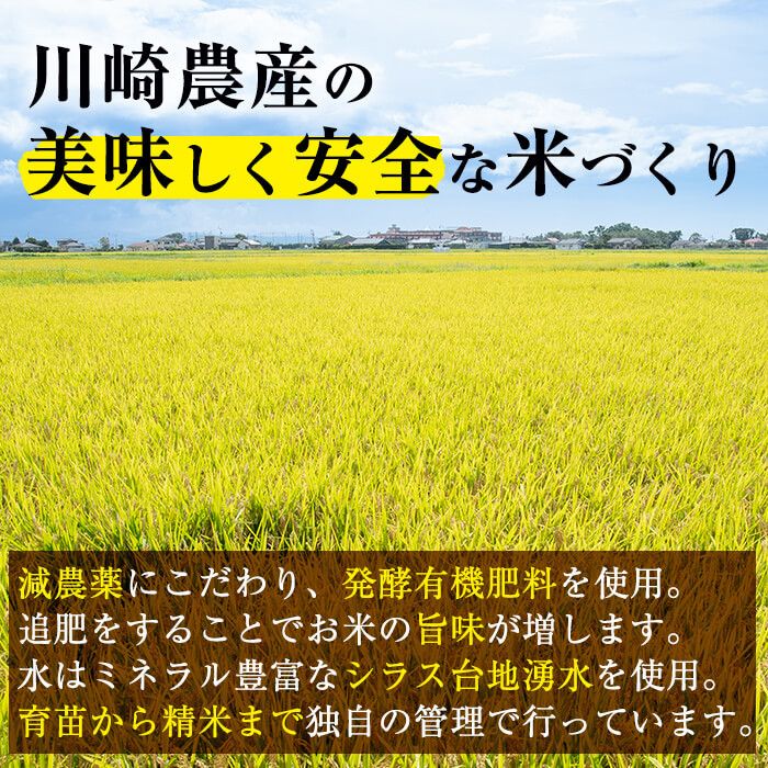 私たち川崎農産はシンプルに「美味しく安全な米づくり」だけを考えて米を作っております。だからこそ減農薬や害虫などの生態を勉強し、環境保全型の農業スタイルを築いてきました。一般の農家よりも手間隙はかかりますが、それだけ自分たちの作る米に自信があります。だからこそ、私たちは自作の米を、直接地域の方に食べていただき、毎年ダイレクトに評価受けることにしています。今回は、その口コミから志布志市のふるさと納税の返戻品へ登録することとなりました。味には絶対の自信があります。ぜひ この機会にご賞味ください。