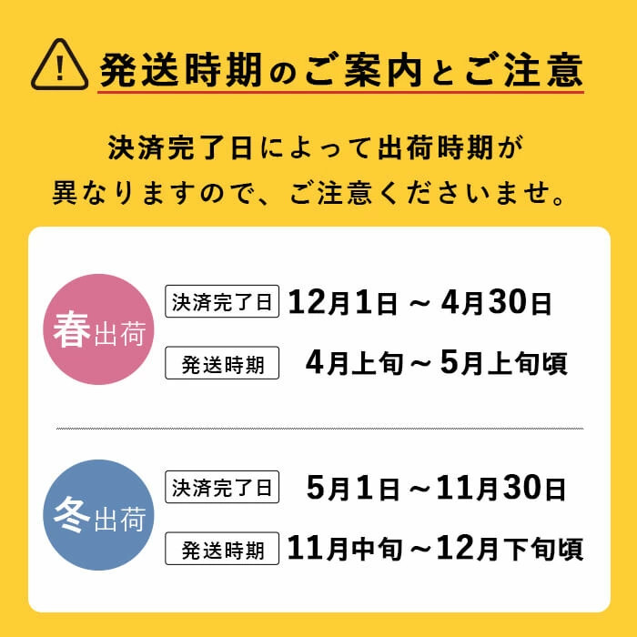 | 発送期日 | 【配送】「種類」のプルダウンメニューをご選択の上、配送期日をご確認くださいませ。 ※ご寄附の前に必ずご確認ください ・配送日のご指定は承っておりません。 ・注文ステップ内の備考欄へ不在日のご入力をお願いいたします。 ・配送時期につきましては、お申込み後に配信している「申し込み完了メール」をご確認くださいませ。 以上をご了承のうえ、お申込みをお願い申し上げます。 ※寄附後の変更・キャンセルは受け付けておりませんので、予めご了承ください。 |