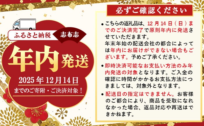 2025年12月14日までのご入金で年内発送 ※こちらの返礼品に関しましては、12/14までのご決済完了で原則年内に発送させていただきます。 年末・年始のお届けになる可能性がございますので、不在期間がある方は、必ず備考欄にご記入をお願いいたします。 ただし、年末年始の配送会社の状況によっては年内にお届けができない場合もございます。 また、年内に発送することで不在期間中のお届けになるなど、返送の恐れがある場合は、年内での発送を見合わせる場合もございます。予めご了承ください。 ※年内発送はクレジットカード決済のみが対象となります。 郵便振込につきましては、ご入金の確認に時間がかかりますため、年内発送の対象外となります。 ※配送日の指定はできませんが、不在期間がある方は、必ず備考欄にご記入をお願いいたします。 不在期間の入力がないなど、お客様のご都合により商品を受取になれなかった場合、返品対応や再送はできかねます。 ※寄附後のキャンセルは受け付けておりませんので、予めご了承ください。 |