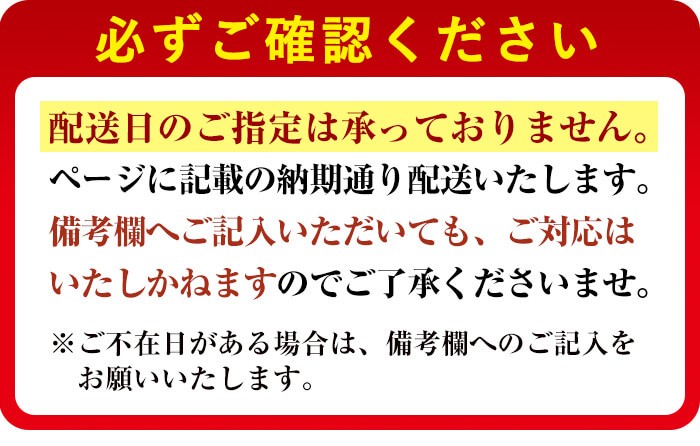 入金確認後、翌月下旬から2か月に1回お届け ※お届けに関して 志布志市では、原則入金確認後翌月までの配送とさせていただいております。 つきまして不在日の入力は、入金確認後翌月までの範囲内でお願いします。 入金確認後翌々月以降の設定をされますとお礼品の価格変動や在庫の確保が困難となりお礼品をお届けできませんのでご理解ください。 ※寄附後のキャンセルは受け付けておりませんので、予めご了承ください。 |