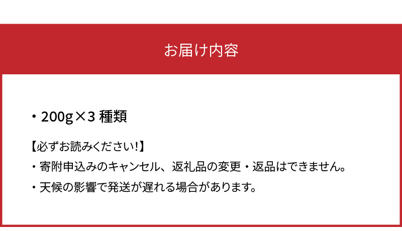 | 容量 | 200g×3種類 <豆or粉からお選びください> 【保存方法】 湿気の少ない冷暗所で保存 【原材料名】 コーヒー豆(原産国は裏面に表示) |