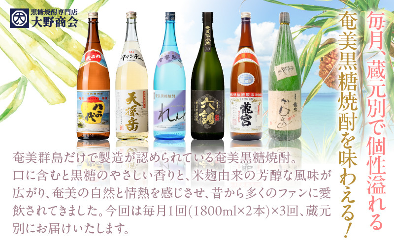 今回はそんな黒糖焼酎を、毎月1回(1800ml×2本)×3回、蔵元別にお届けいたします。