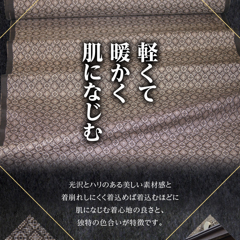 絹100%、光沢とハリのある美しい素材感と軽くて暖かく、着崩れしにくいことが特徴で、着込めば着込むほどに肌になじむ着心地の良さと、独特の色合いをお楽しみください。