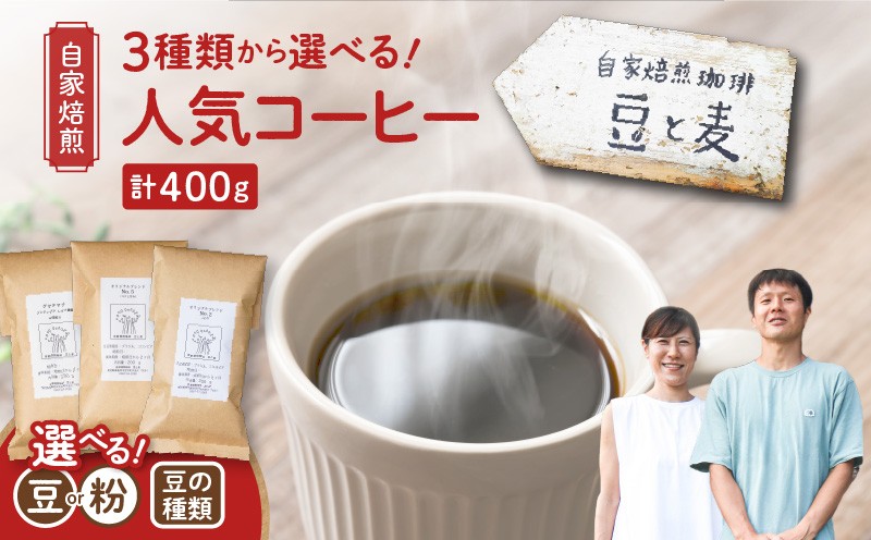 チョイスPayポイントと交換できる品 「豆と麦」で、特に人気の高いコーヒーをご用意しました。 <選べる>【自家焙煎】豆と麦 グアテマラ・ブレンドNo.5・ブレンドNo.2(豆 or 粉)計400g(200g×2袋) A017-018