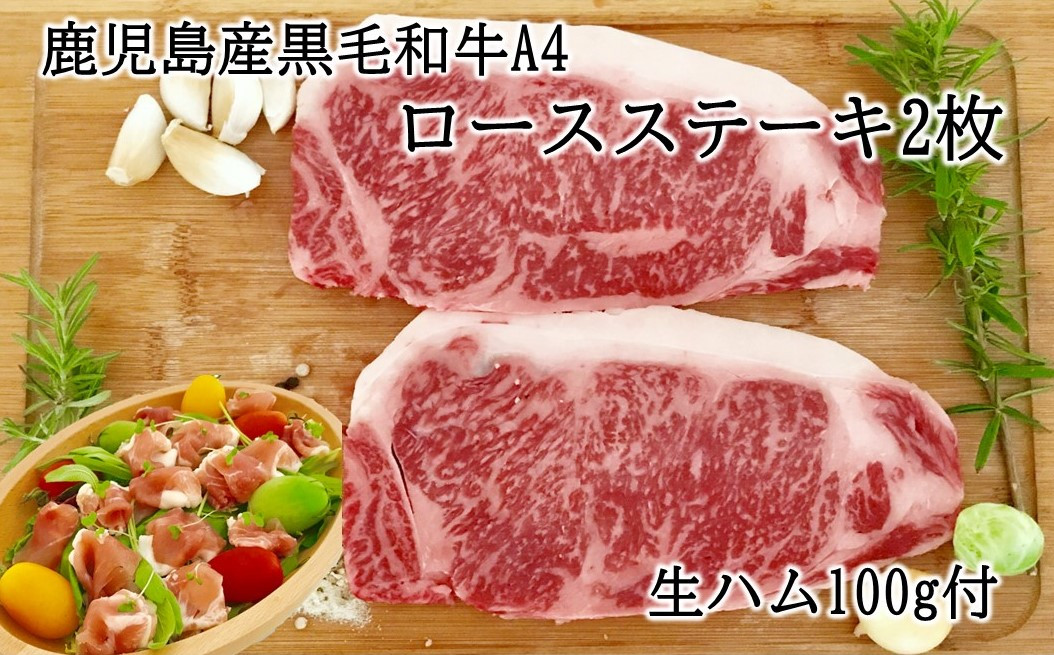 027-04 鹿児島産黒毛和牛A4ロースステーキ2枚 生ハム100g付