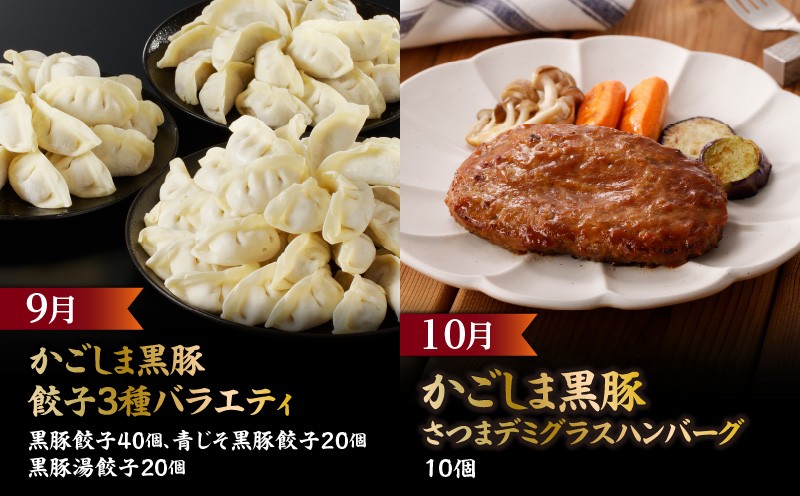 | 容量 | 【1月】鹿児島黒牛すきやき用スライス600g 【2月】ブランド地鶏「黒さつま鶏」しゃぶしゃぶセット(4~5人前) ・黒さつま鶏しゃぶしゃぶ肉600g、鶏白湯スープ1kg、ラーメン2玉、柚子胡椒6g 【3月】鹿児島県産黒豚しゃぶしゃぶ用スライス900g 【4月】黒豚餃子40個と自家製しょう油麹の黒豚餃子20個 【5月】かごしま黒豚さつまロールステーキ15枚 【6月】鹿児島産黒豚生ハム切落し800g 【7月】自社牧場黒毛和牛切落し900g 【8月】鹿児島産黒毛和牛A4ランクロースステーキ2枚 【9月】かごしま黒豚餃子3種バラエティ ・黒豚餃子40個、青じそ黒豚餃子20個、黒豚湯餃子20個 【10月】かごしま黒豚さつまデミグラスハンバーグ10個 【11月】剛火あぶりの黒さつま鶏さしみ(タタキ)500g 【12月】5等級鹿児島黒牛300gと茶美豚1.2kgのしゃぶしゃぶセット |