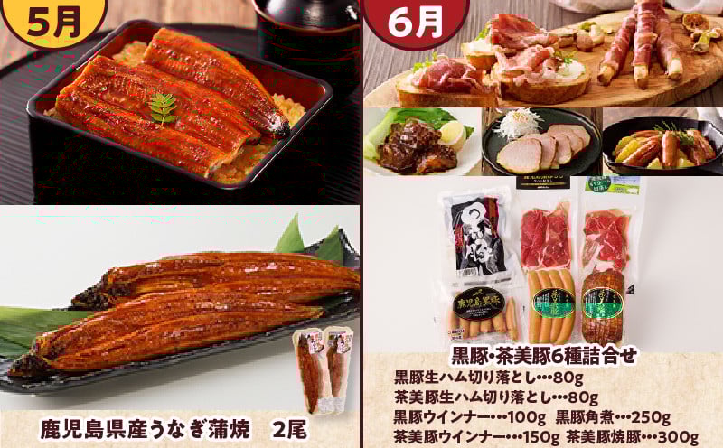 | 容量 | 【1月】知覧茶ペットボトル500ml×24本 【2月】鹿児島黒牛のすきやき用600gセット 【3月】鹿児島県産タンカン3kg 【4月】かごしま黒豚さつまバラエティセット (鹿児島黒豚バラしゃぶしゃぶ用300g、ハンバーグ3個、バラ味噌漬け180g、ロース味噌漬け180g、餃子8個入×2、ウィンナー5本入×2) 【5月】鹿児島県産うなぎ蒲焼2尾 【6月】黒豚・茶美豚6種詰合せ (黒豚生ハム切り落とし80g、茶美豚生ハム切り落とし80g、茶美豚焼豚300g、黒豚角煮250g、黒豚ウインナー100g、茶美豚ウインナー150g) 【7月】塩干物うまいものセット (お茶仕立てあじ開き6枚、鯛開き1枚、とろさば開き5枚、あじみりん3枚、さばみりん2枚) 【8月】ビールのお供詰合せ (さつま串たれ4本入×3、さつま串塩4本入×3、レア炭火焼200g×3、ぼんじりたれ味付150g×3) 【9月】南国白くま・南国白くまマンゴーセット (南国白くま180ml×5個、南国白くまマンゴー180ml×5個) 【10月】長吉屋さつま揚げ詰合せ(生)32枚 【11月】鹿児島県産新米ミルキークイーン5kg 【12月】鹿児島黒豚しゃぶしゃぶ食べ比べ1100g+生ハム100g |