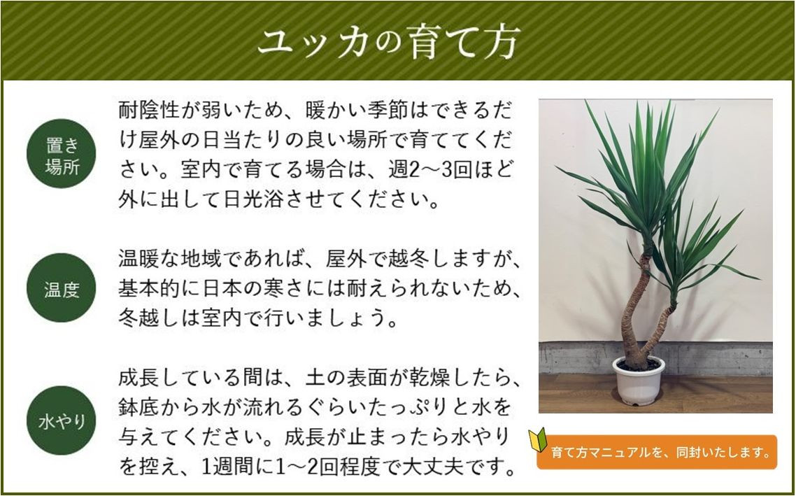 | 容量 | 観葉植物 ユッカ1鉢 (鉢 縦17cm横25cm) 重量約3.5kg、高さ約100~120cm、横幅約50~65cm ※自然の産物ですので個体差がございます。予めご了承くださいませ。 ※育て方マニュアルを同封いたします。 |