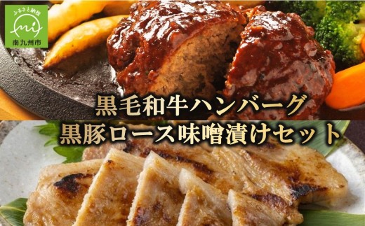 精肉店自慢の2品詰合せセットです。 黒毛和牛を100%使用したハンバーグと、南九州市産の鹿児島黒豚ロース味噌漬けのどちらもお楽しみいただけます。 自慢の逸品をぜひお楽しみください。 ■注意事項/その他 ※画像はイメージです。 〈地場産品に該当する類型・理由〉3号 製造にかかる原材料のブロック肉の仕入れからスライス・ミンチ,調味,成形,包装の完成までのすべての工程を市内工場の職人及び機械の手によって丁寧に行っており,本工程による付加価値は返礼品の付加価値のうち約80%を占めているため