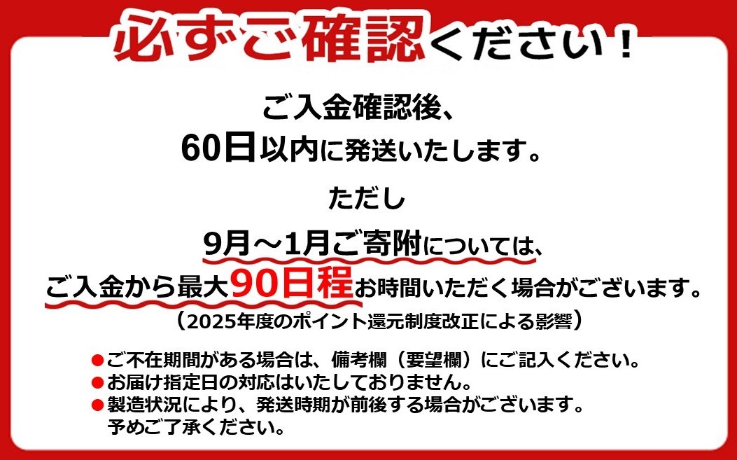 ご入金確認後、60日以内に発送いたします。 ただし9月~1月ご寄附については、ご入金から最大90日程お時間をいただく場合がございます。 (2025年度のポイント還元制度改正による影響) ※製造状況により発送時期が前後する場合がございます。予めご了承ください。 ※不在期間がある場合は、備考欄(要望欄)にご記入ください。 |