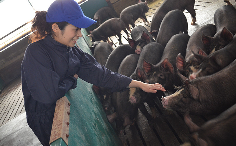 黒豚生産農場は、農林水産省の飼養衛生管理基準に則り、生産段階での危害要因をコントロールして飼養衛生管理を行っています。エサにはヨモギや海藻などをブレンドした地養素やさつまいもを配合した独自飼料を与え、更に黒豚飼育後期には液状で餌を給餌するリキッドフィーディングシステムを導入し、時期に応じて焼酎もろみなどの地域の未利用資源も活用するなど、より良い環境での黒豚の飼育を行っています。枝肉カット処理工場ではISO22000を取得。グループ一貫で皆様に安全をお届けできるよう、食肉の生産を行っています。