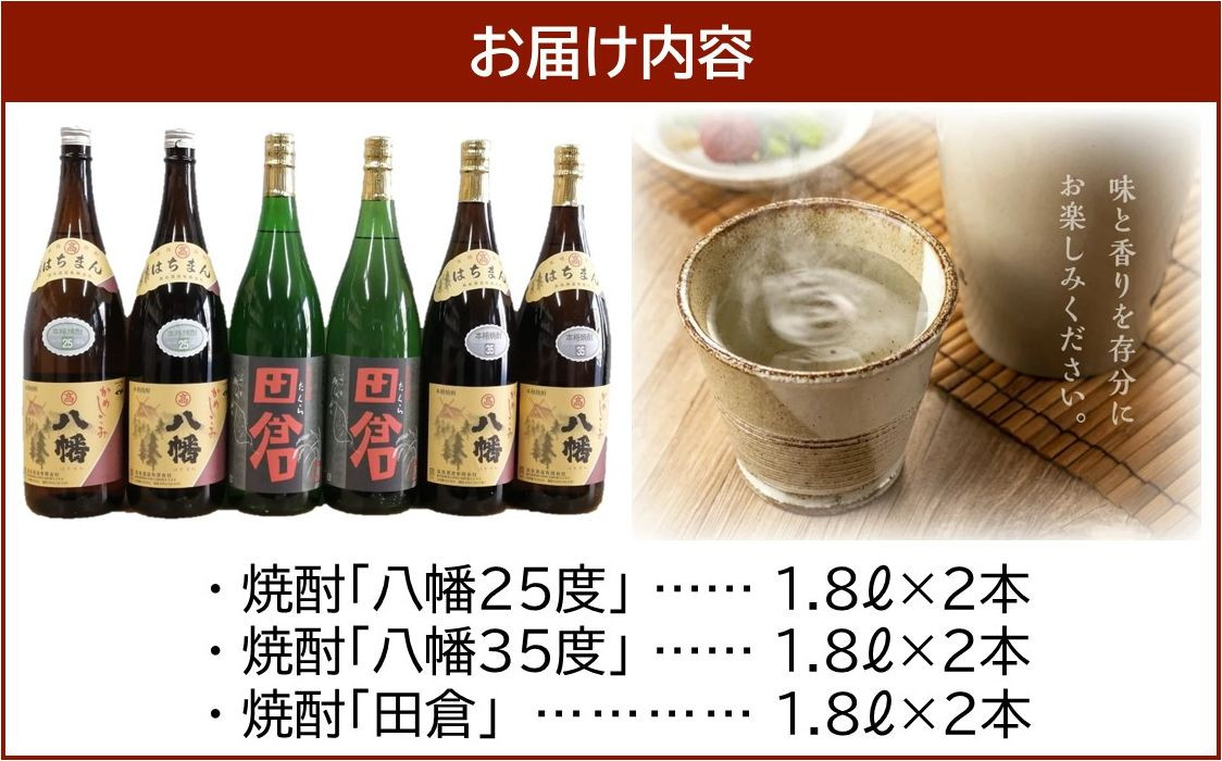 高良酒造の焼酎八幡25度1.8L、八幡35度1.8L、田倉1.8Lの各2本で計6本セットです。