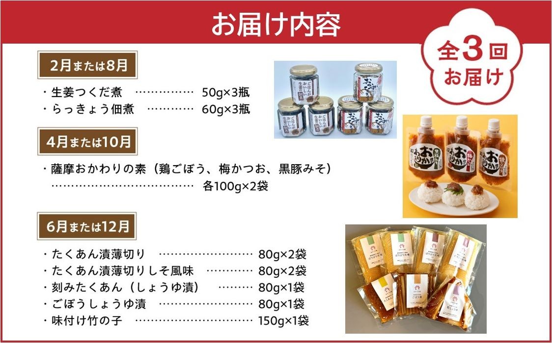 | 容量 | 【2月/8月】 生姜つくだ煮50g×3瓶 らっきょう佃煮60g×3瓶 【4月/10月】 薩摩おかわりの素(鶏ごぼう、梅かつお、黒豚みそ)各100g×2袋 【6月/12月】 たくあん漬 薄切り 80g×2袋 たくあん漬 薄切りしそ風味 80g×2袋 刻みたくあん(しょうゆ漬) 80g×1袋 ごぼうしょうゆ漬 80g×1袋 味付け竹の子 150g×1袋 |