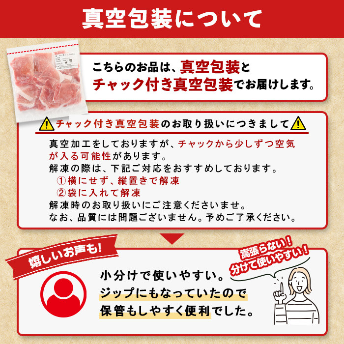 | 容量 | 1回目: ・豚切り落とし300g×4P ・豚バラスライス400g×1P ・豚肩ロースしゃぶしゃぶ用300g×1P ・豚ロース生姜焼き用350g×1P 合計2.25kg(真空包装) 2回目: ・豚バラスライス400g×2P ・豚ロース生姜焼き用350g×2P 合計1.5kg(真空包装) 3回目: ・豚肉切り落とし300g×8P 合計2.4kg(真空包装) |