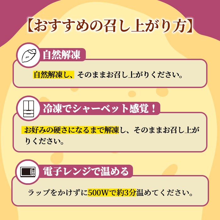 約3.0kgの焼き芋を小分けし、真空パックでお届けしますので、必要な量だけ封をあけ凍ったままで「アイス焼き芋」、解凍し「冷やし焼き芋」、お皿にのせてラップして温めて「ほかほかの焼き芋」どちらでも美味しく頂けます。