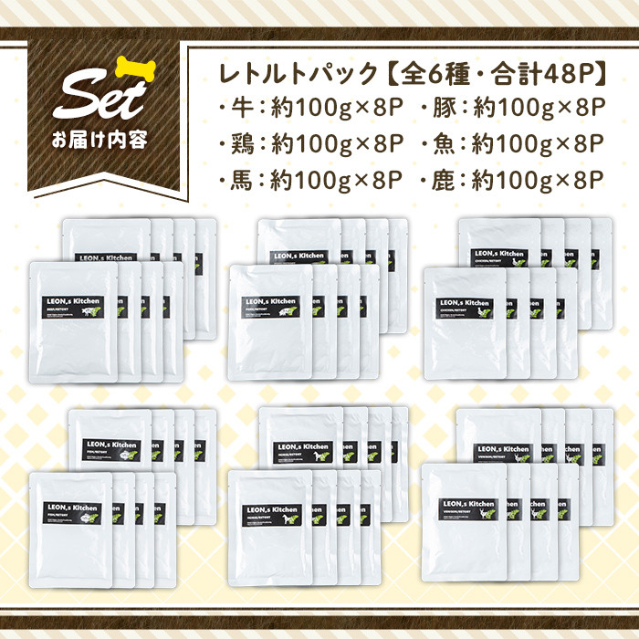 | 容量 | 【全6種・レトルトパック合計48P】 ・牛:約100g×8P ・豚:約100g×8P ・鶏:約100g×8P ・魚:約100g×8P ・馬:約100g×8P ・鹿:約100g×8P |