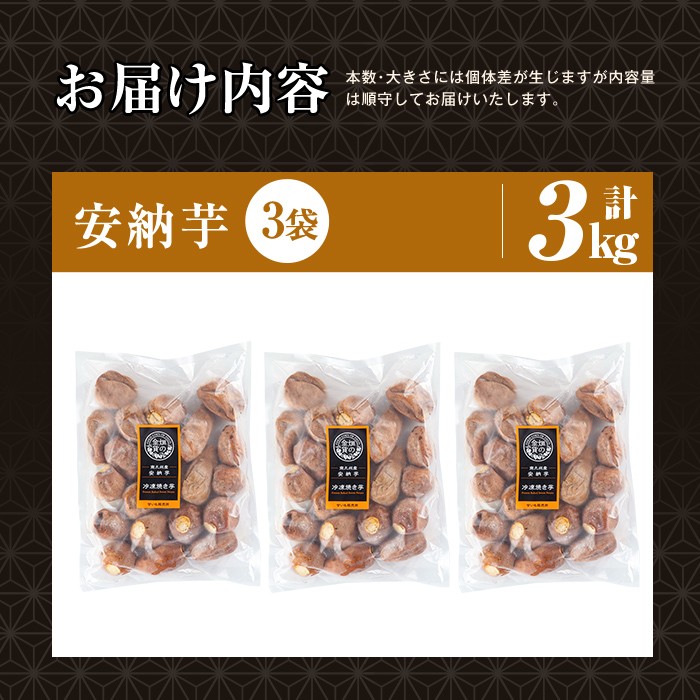 南九州産さつまいもを焼き芋にしてお届け!安納芋はスイーツのような濃厚な甘味♪ a0001-A3 冷凍焼き芋!畑の金貨・やきいも(安納芋3kg)【甘いも販売所】姶良市 焼き芋 訳あり 冷凍 焼芋 やきいも さつまいも さつま芋 熟成 蜜