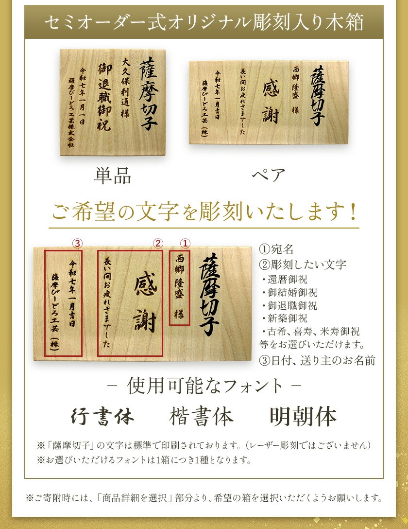地場産品基準 3号 適合理由:区域外からガラスの原材料を仕入れ、区域内の自社工場にて薩摩切子ができるまでの製造・加工を行っている。工程作業は、溶解、色被せ、成形、徐冷、割付、カット、磨き、検査の工程を行い販売を行っている。