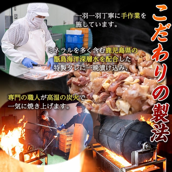 甑島で取水される海洋深層水の濃縮海水(塩分5%)を中心に配合した特製タレに一晩漬け込み熟成させ、高温の炭火で一気に焼き上げています。