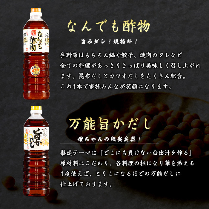 | 容量 | 鰤王醤油(1L)×1本 淡口上級ほまれ(1L)×1本 なんでも酢物(1L)×1本 万能旨かだし(1L)×1本 |
