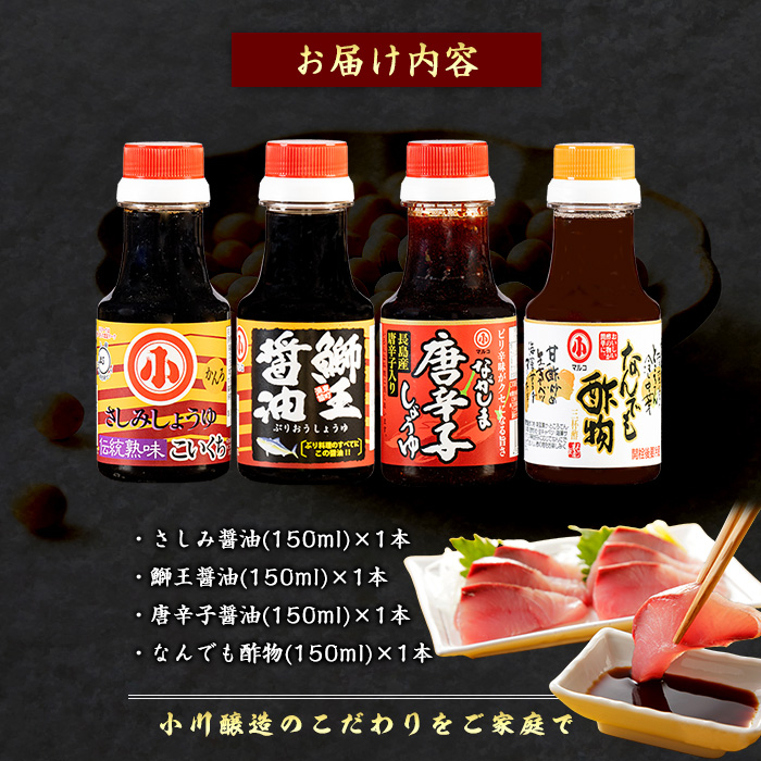 小川醸造の人気商品を詰め合わせました。「さしみ醤油150ml」「なんでも酢物150ml」「鰤王醤油150ml」「長島とうがらし醤油150ml」の入った食べ比べセットです。.