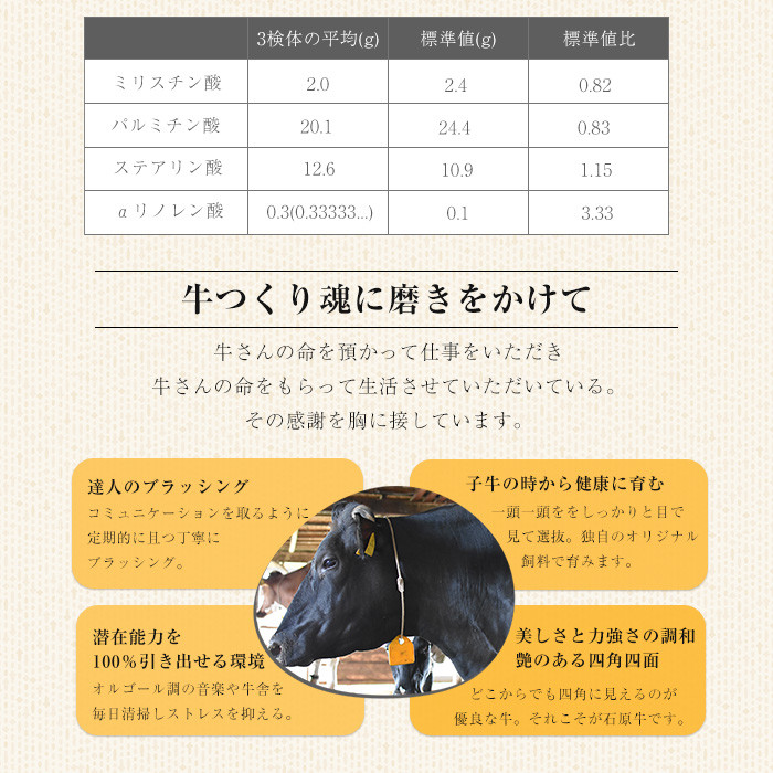 石原牛は導入から肥育そして加工まで、全て職人の手で造られています。 よく、”良いお肉(サシが多めのお肉)は数枚で胃がもたれる”という言葉を耳にしますが、石原牛は違います。すっきりとした融点30°以下の甘くとろける脂質、そしてその脂の味を拘りぬいて追及しています。「必須脂肪酸」であるオメガ3脂肪酸の含有量が通常の黒毛和牛の3.3倍以上あるという検査結果も出ています。生産者が,30年以上の試行錯誤の末たどり着いた究極の「脂の味」を、是非ともご堪能ください。