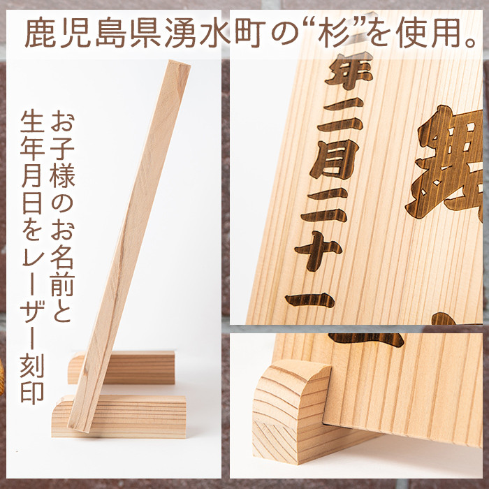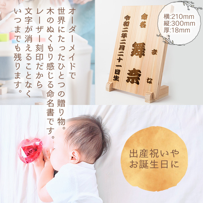 A4サイズの杉材に、お子様の命名、誕生日をレーザーで焼き付けます。