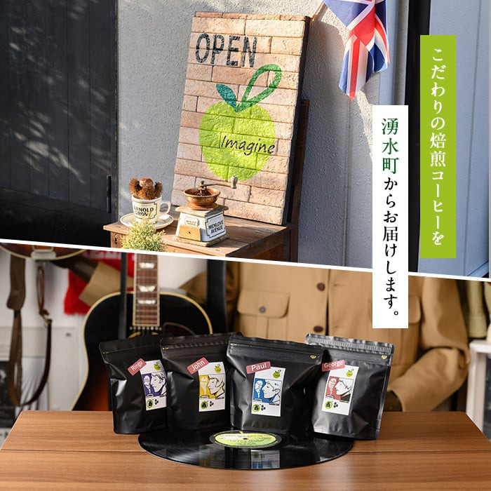 「ジョンは深煎り」「ポールは中深煎り」「ジョージは超浅煎り」「リンゴはノンカフェイン」