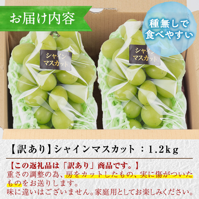 地域の生産者応援の品 冷涼な気候で育てた湧水町産のシャインマスカット! y418 ≪先行予約受付中!2026年8月中旬以降順次発送≫ 訳あり!シャインマスカット(約1.2kg) 国産 九州産 鹿児島産 湧水町 マスカット 葡萄 ぶどう ブドウ 果物 くだもの フルーツ 旬 訳アリ ワケあり 家庭用 種無し 種なし 【大倉野 隆】