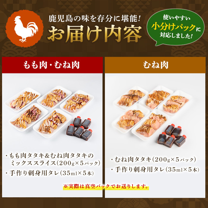 鹿児島県産鶏刺しセット!新鮮な鶏肉を当店手作り刺身タレでお召し上がり下さい♪ A02 <発送時期・部位が選べる>鹿児島特産 鶏のたたき(約1kg・200g×5P) 鳥刺し 鶏刺し 肉 鳥刺 鶏タタキ タタキ 鶏肉 親鶏 とり トリ とりにく 刺身 鶏刺身 おつまみ むね もも モモ ムネ タレ 鶏さし とりさし 鶏もも セット 冷凍 【あきらの店】