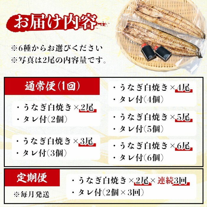 | 容量 | うなぎ白焼き(タレ付) ・2尾 ・3尾 ・4尾 ・5尾 ・6尾 ・総計6尾(定期便:2尾×全3回) ※毎月連続 ※ご希望の尾数をお選びください ※選択肢により寄附額が異なりますのでご注意ください。 ※大きさは時価により変動することがあります。 ※生産の都合上、お届けに時間がかかることがあります。 |