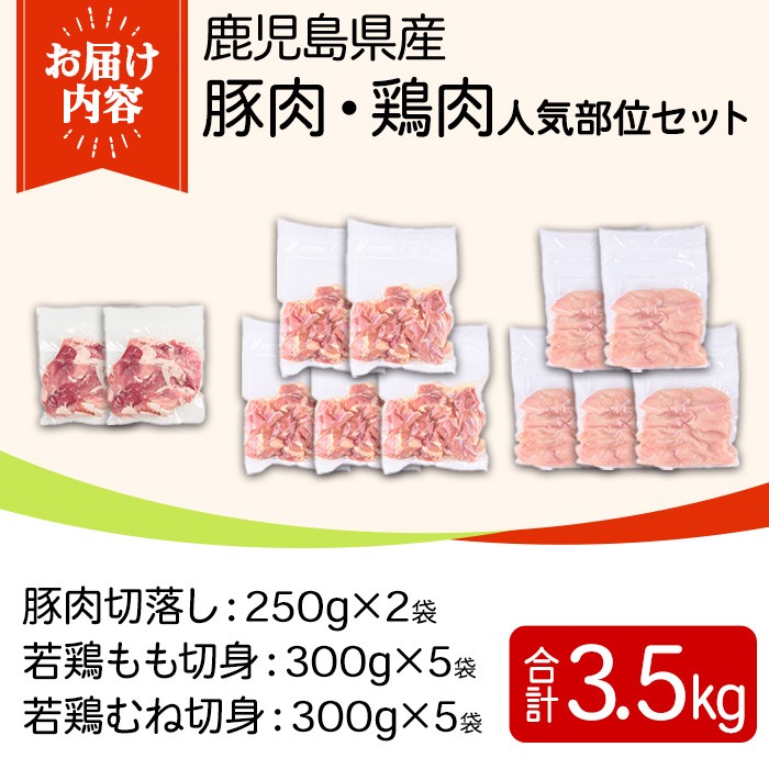 鹿児島県産の豚肉・鶏肉の人気部位をセットでお届け♪ y598 鹿児島県産豚肉・鶏肉人気部位セット(合計3.5kg) 国産 九州産 鹿児島県産 鶏肉 鳥肉 鶏 とり 若鶏 豚肉 切り落とし 切落し 冷凍 もも モモ むね ムネ 小分け 真空 【TRINITY】