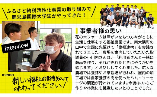 大隅の地域産業となじみやすい花・野菜づくりや、ハム・ソーセージ、お惣菜などの食品づくりを通して、社会とのつながリをもつことを目指しています。
