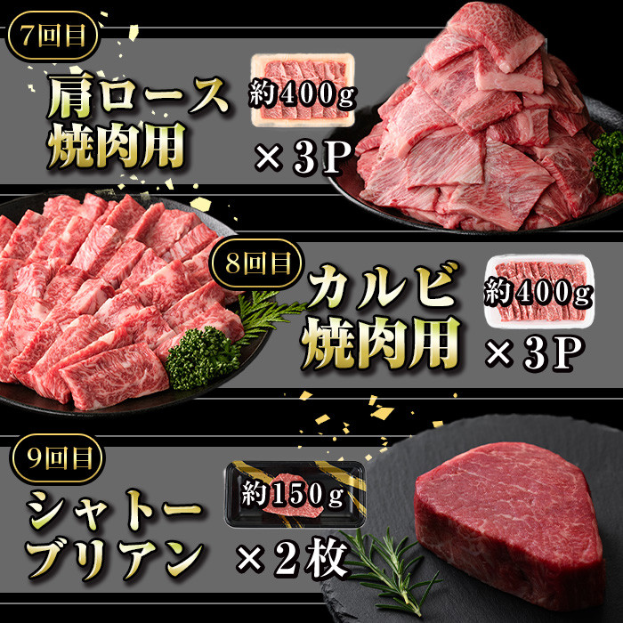 | 容量 | 鹿児島黒牛 おまかせ12回分定期便 1回目 モモスライス 約400g×4パック 2回目 リブロースしゃぶしゃぶ用 約500g×2パック 3回目 サーロインステーキ 約200g×4枚 4回目 モモ・バラカルビ焼肉用 約400g×3パック 5回目 肩ロースすき焼き 約400g×4パック 6回目 ヒレステーキ 約120g×4枚 7回目 肩ロース焼肉用 約400g×3パック 8回目 カルビ焼肉用 約400g×3パック 9回目 シャトーブリアン 約150g×2枚 10回目 牛小間切れ 約400g×7パック 11回目 ロースすき焼き 約500g×2パック 12回目 リブロースステーキ 約300g×4枚 |