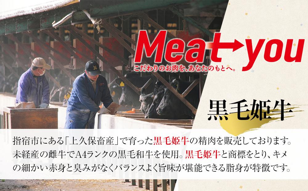 未経産の牝牛でA4ランクの黒毛和牛を使用。黒毛姫牛と商標をとり、キメの細かい赤身と臭みがなくバランスよく旨味が堪能できる脂身が特徴です。