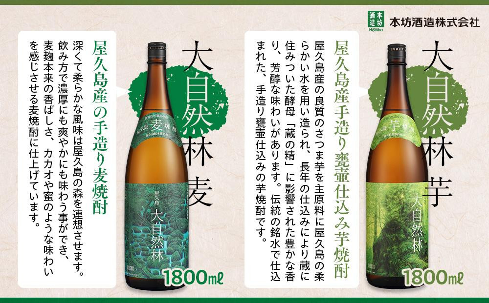 | 容量 | ・水ノ森 1,800×2本(アルコール度数:25度) ・屋久杉 1,800×2本(アルコール度数:25度) ・大自然林 芋 1,800×1本(アルコール度数:25度) ・大自然林 麦 1,800×1本(アルコール度数:25度) 計6本 |