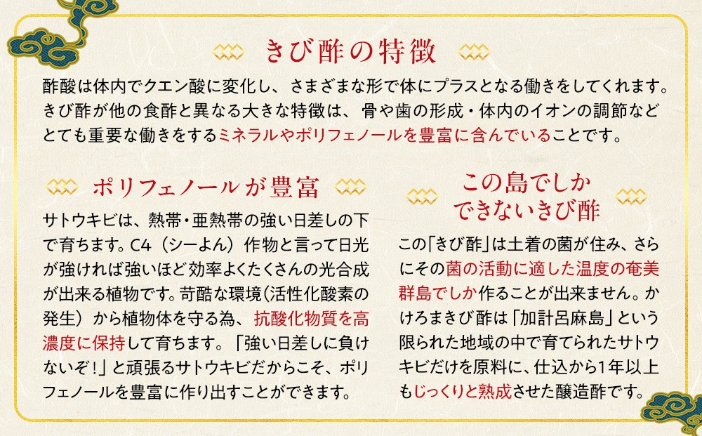 さとうきびを原料とし酢酸菌を自然発酵によりじっくり熟成させた数少ない国産の本格天然醸造酢です。添加物を一切使わずに作られたきび酢はミネラルや,ポリフェノールを含み、まろやかな味わいに。
