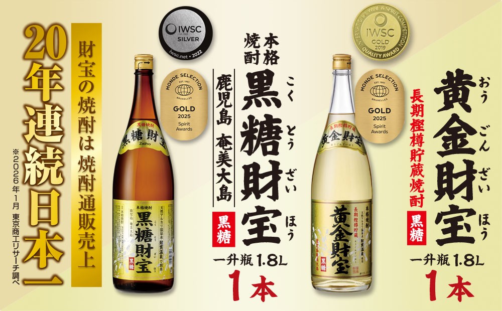 ミネラルウォーター「財寶温泉水」を割水に使用した黒糖焼酎!まろやかな味わいです♪ 奄美黒糖焼酎「黒糖財宝」1.8L・長期樫樽貯蔵「黄金財宝」1.8L 各1本セット 鹿児島県 奄美群島 奄美大島 龍郷町 黒糖 焼酎 お酒 蒸留酒 アルコール 糖質ゼロ プリン体ゼロ 低カロリー 温泉水を割水に使用 財宝 財宝温泉 晩酌 プレゼント 一升瓶 1800ml 2本