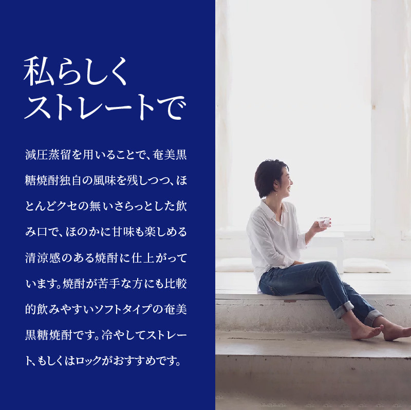 減圧蒸留を用いることで、奄美黒糖焼酎独自の風味を残しつつ、ほとんどクセの無いさらっとした飲み口で、ほのかに甘味も楽しめる清涼感のある焼酎に仕上がっています。
