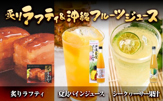 「シークヮーサー果汁」 沖縄の特産品でシークヮーサーにはフラボノイドの1種ノビチレンが多く含まれています。 お召し上がり方としては清涼飲料水としてお好みで冷水に5~10倍薄めてグラニュー糖、シロップ、蜂蜜等を加えてご飲料ください。 「夏実パインジュース」 夏の一番甘味がある時期に収穫した100%ストレートパインジュースです。 「炙りラフティ」 箸でほぐれるほどの柔らかさに仕上げました。 【製造地】那覇市 事業者名:株式会社 あさひ 連絡先:098‐857-0779