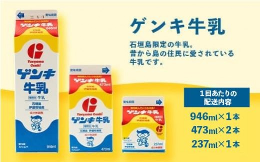| 容量 | 通常便・定期便(2回・3回・5回・6回)選べます。 ※1回あたりの配送内容量は下記の通りです。 ゲンキ牛乳 946ml×1 ゲンキ牛乳 473ml×2 ゲンキ牛乳 237ml×1 ゲンキクール 946ml×1 ゲンキクール 473ml×2 ゲンキクール 250ml×1 ゲンキカフェ 946ml×1 ゲンキカフェ 473ml×3 ゲンキさんぴん茶ミルクティー 946ml×1 ゲンキさんぴん茶ミルクティー 473ml×3 ゲンキ坊やクリアファイル×1 |
