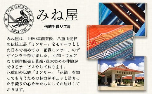伝統工芸品である八重山みんさー織の名刺入れは、手織りの風合いと上質な質感が楽しめるクールな仕上がりで、繊細なテキスタイル模様は個性と上質感をより一層引き立てます。 ・材質/表面:手織綿(撥水加工)・牛革 裏地:シャンタン生地(綿) ・サイズ/縦7㎝×横11.5㎝×厚さ2cm ・仕様/メインポケット1,ポケット3,名刺約45枚収納 「八重山ミンサー」として、国の伝統工芸品に指定されている“みんさー織”。およそ30にもわたる手作業の工程を経て、職人が織りなす心のこもった織物。「いつ(五つ)の世(四つ)までも末永く・・・」という想いで織られた絣模様のデザインを、現代の感覚にあったデザインにしながら、日常生活の中で活きるものにしています。染色にも独自の工夫を施し、八重山の青い海や鮮やかな草花の色彩を表現しつつ素朴な風合いに仕上げています。
