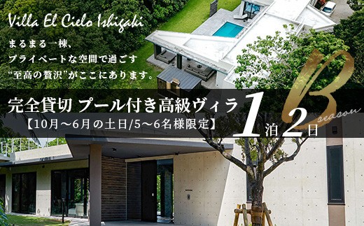 容量 | Villa el cielo Ishigaki ーLUNAー 完全貸切のプール付き高級ヴィラ 5~6名様でのご宿泊限定 10月〜6月の土日 (Bシーズン) 1泊宿泊券 クーポン内容を適用した、ご予約専用URLをメールで付与いたします。 |
