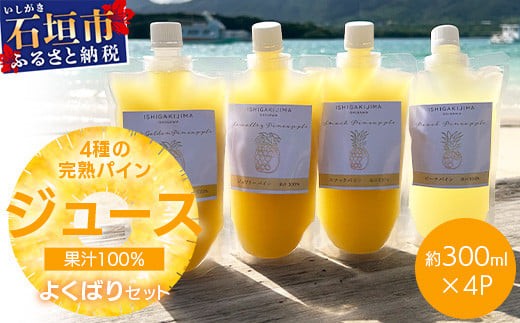 石垣島の完熟で収穫した、スナックパイン、ピーチパイン、ジュワリーパイン、てとの黄金パインの果実のみを、スロージューサーで丁寧に搾汁した濃厚ジュースを各1パックの合計4パックお届けいたします!
