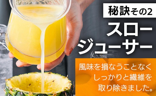 青果で出荷可能な完熟パインの果実のみを1パックに約1.5個と贅沢にスロージューサーで搾り、丁寧にパックに詰めて特殊な方法で急速冷凍しています!