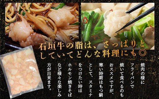 焼肉の様にフライパンで焼いて食べるのもおススメですが、寒い時期はもつ鍋として、スタミナをつけたいときはホルモン焼きそばなど様々な楽しみ方が出来ます。和牛の中でも石垣牛の脂はミネラルの甘みのバランスがよく、さっぱりとしていてどんな料理にも合うと思います。