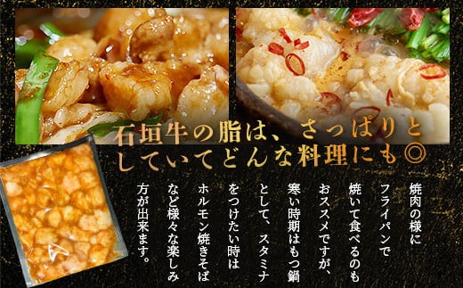 焼肉の様にフライパンで焼いて食べるのもおススメですが、寒い時期はもつ鍋として、スタミナをつけたいときはホルモン焼きそばなど様々な楽しみ方が出来ます。和牛の中でも石垣牛の脂はミネラルの甘みのバランスがよく、さっぱりとしていてどんな料理にも合うと思います。