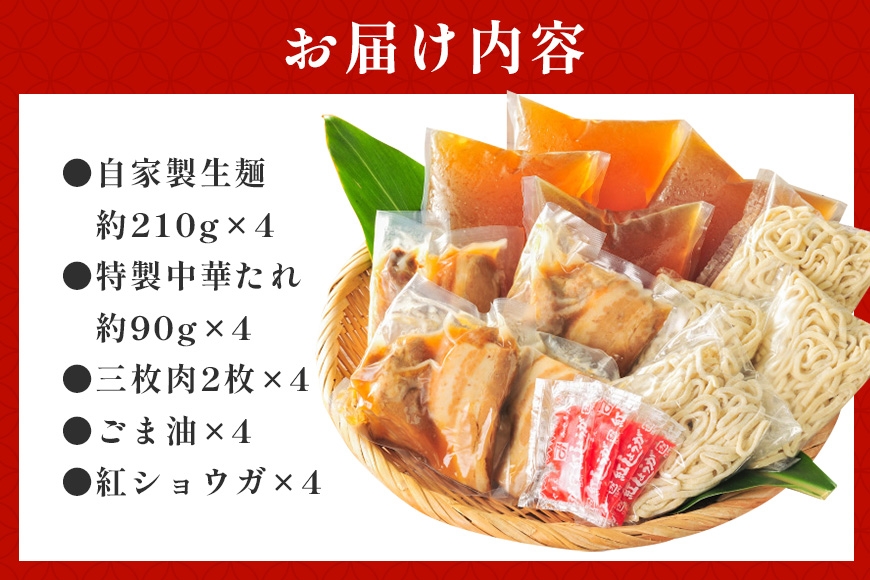 | 容量 | 自家製生麺 約210g×4 特製中華たれ 約90g×4 三枚肉 2枚×4 ごま油 ×4 紅ショウガ ×4 (※薬味・玉子等トッピングは付いておりません。) |