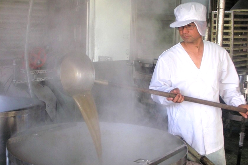 さとうきび汁を地釜で5時間以上も煮詰めて造りますが、5時間煮詰めている間も気が抜けません。火加減の管理など、職人の経験と技をもって、しっかり見ておかなくてはならないのです。素材そのままの味を生かすため、この行程が一番気を使います。
